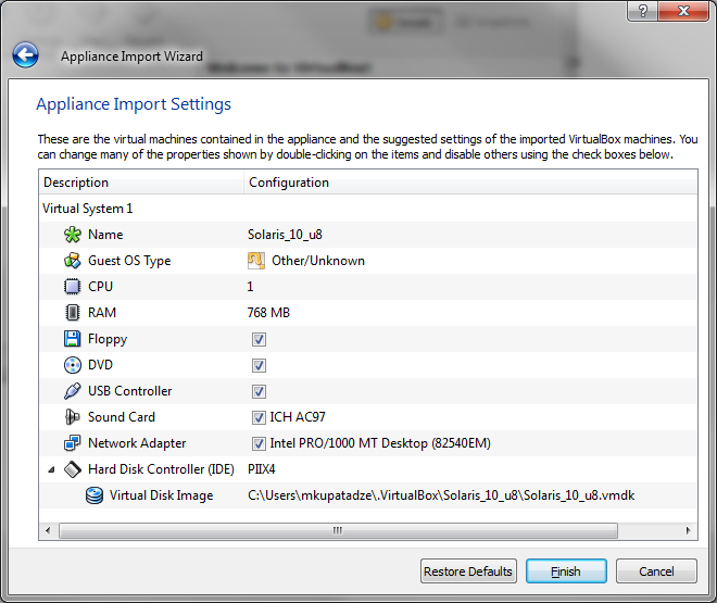 Open VirtualBox, from the menu bar choose File->Import Appliance(Or simply click Ctrl+I), click Choose button and select Solaris_10_u8.ovf file, click Next and you will see the following picture: