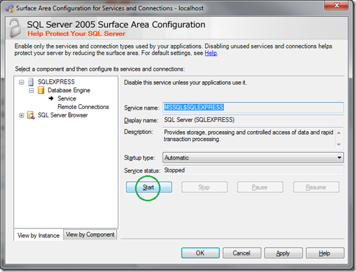 Click Start->All Programs->Microsoft SQL Server 2005->Configuration Tools->SQL Server Surface Area Configuration…Click Surface Area Configuration for Services and Connections