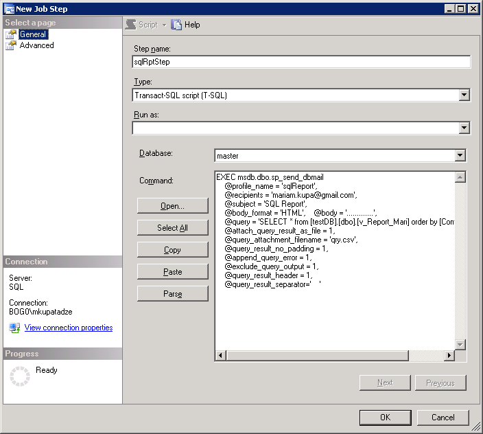 EXEC msdb.dbo.sp_send_dbmail @profile_name = 'sqlReport', @recipients = 'mariam.kupa@gmail.com', @subject = 'SQL Report', @body_format = 'HTML',