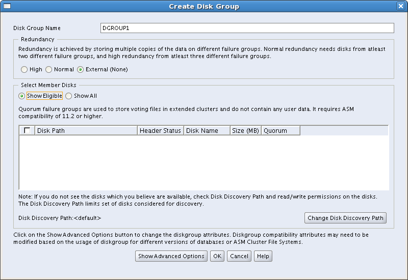 If you are in the middle of grid installation, and trying to create ASM disk group but Eligible(Candidate) disks location is empty, for example like this:Screenshot-Create Disk Group