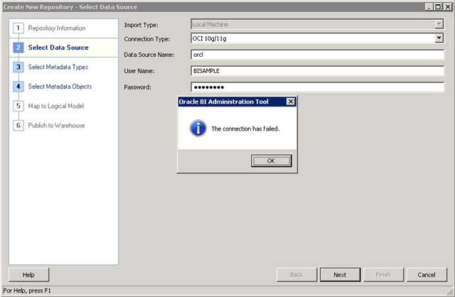 ORACLE BI Admintool.exe “The connection has failed”