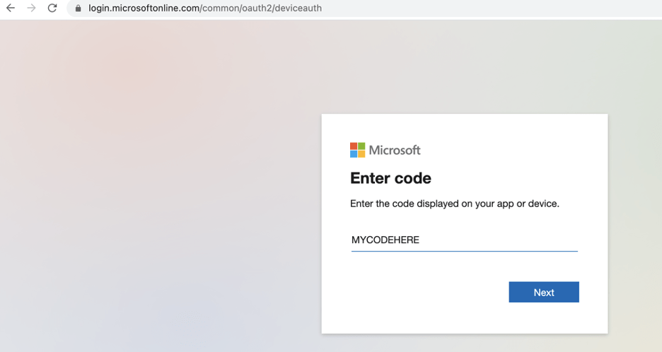 4. Go to https://microsoft.com/devicelogin and enter the mentioned code