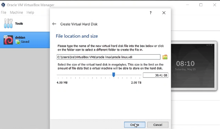 7. Select file size (disk size for VB) and the location, click Create button to finish virtual machine creation process