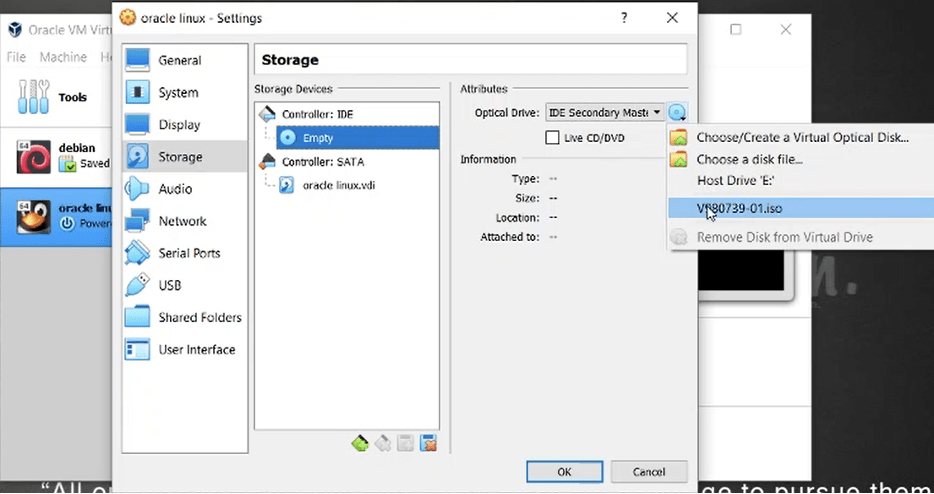9. Navigate to Storage and click CD icon, on the right side of the window, under attributes, click CD icon and add virtual machine’s .iso file.