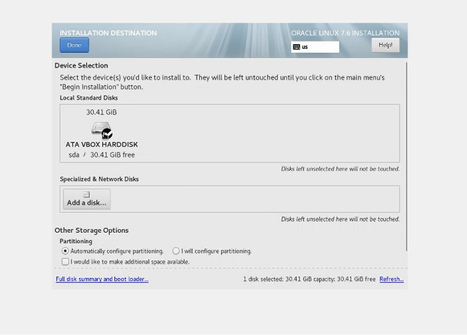 15. Select the disk where you want to install system. You can select virtual disk, that you have created in the previous step or add a new one. Select disk and click Done button;