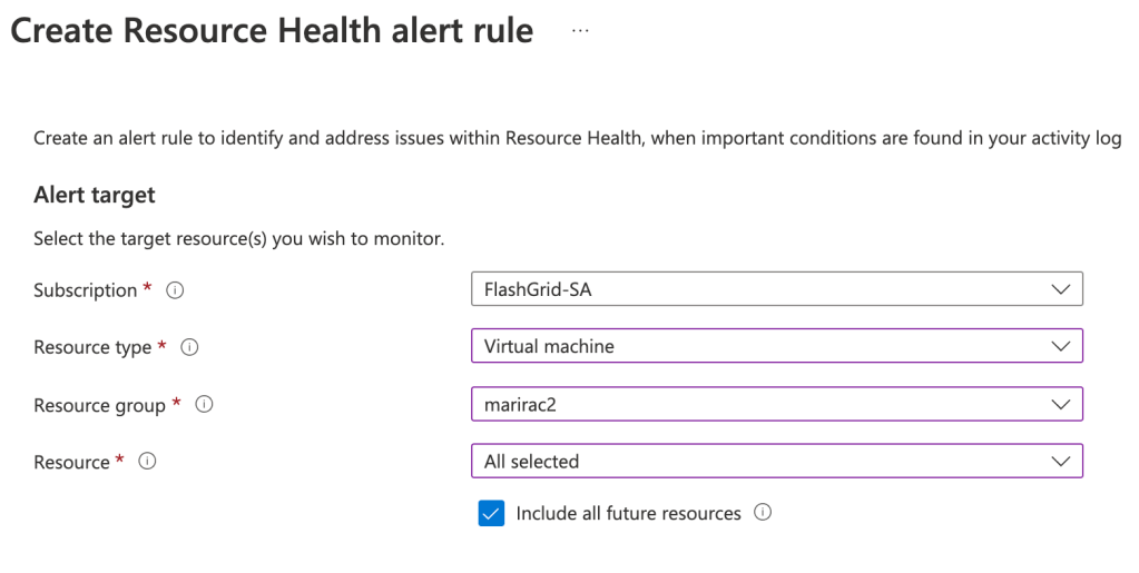 2. From the left side panel choose Resource health -> click Create Resource Health alert rule