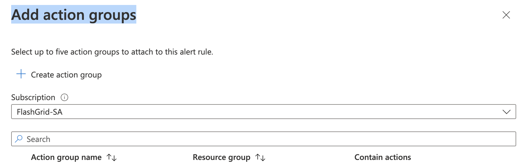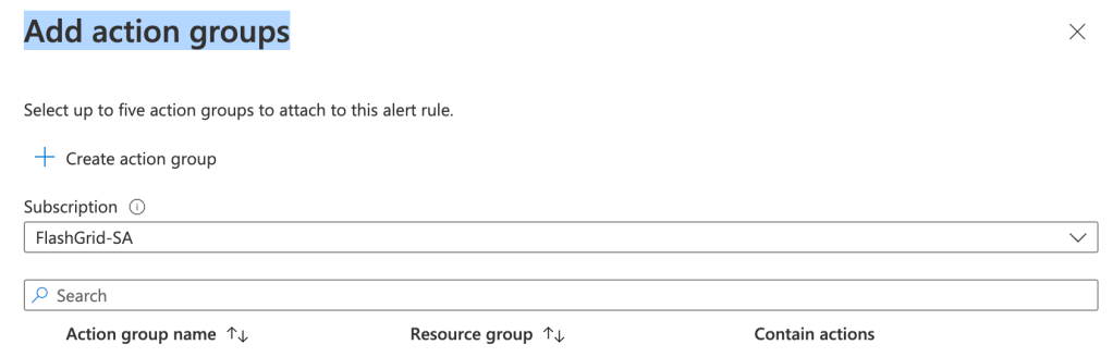 In the Actions section, you have to indicate action groups. As long as we have not created any before, let’s click Add action groups -> Create action group