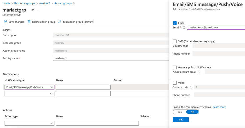 Resource groups -> marirac2 -> from the left-side panel choose Alerts -> Action groups -> choose action group name in my case mariactgrp -> on the Notifications section choose Email/SMS message/Push/Voice -> on the right-side panel click Email checkbox -> enter email address who will be responsible for receiving and handling these alerts -> click OK -> enter desirable name under Notifications section -> click Save changes.
