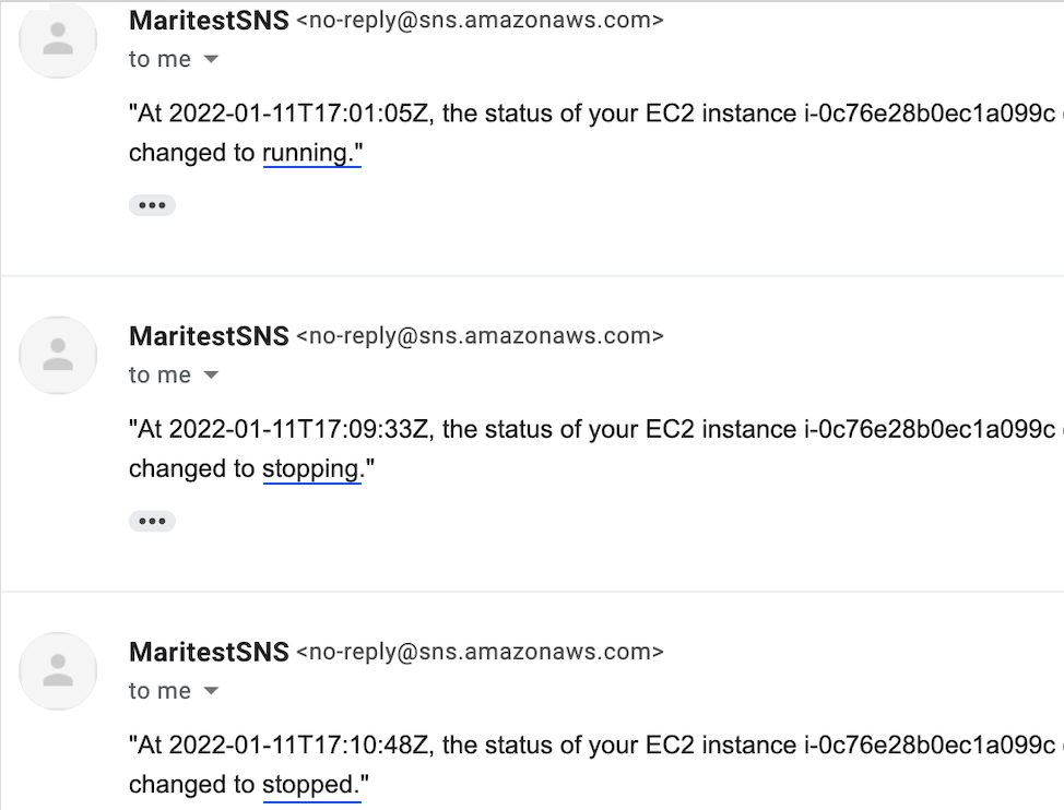"At <time>, the status of your EC2 instance <instance-id> on account <account> in the AWS Region <region> has changed to <state>."