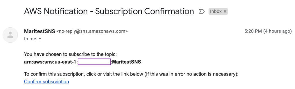 A subscription confirmation email is sent to the address you have entered. Choose Confirm subscription in the email (Screen 3):