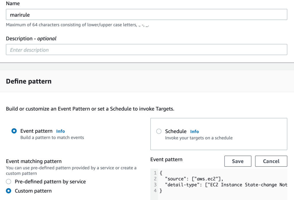 - Create an EventBridge event – where you define rule on instances that will trigger the notification