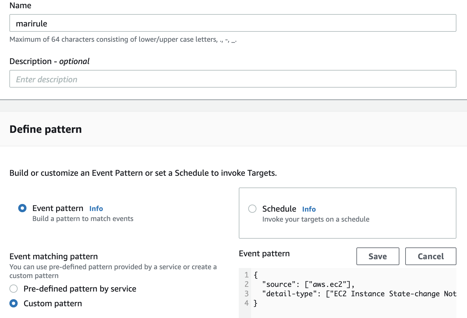 - Create an EventBridge event – where you define rule on instances that will trigger the notification