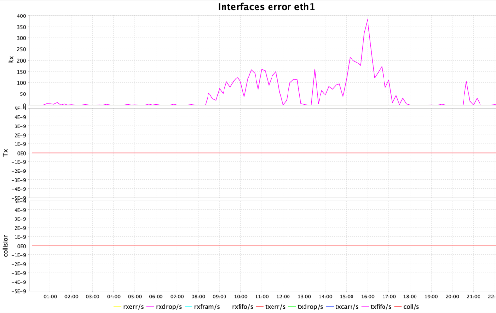 The ksar graph (a tool that interprets output from sar) was displaying peaks for interface errors on eth1 interface, particularly rxdrop/s: