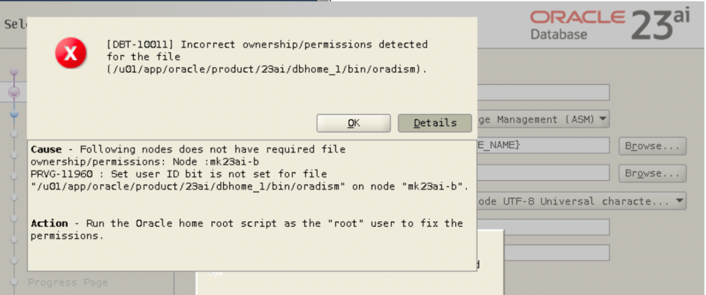 Cause - Following nodes does not have required file ownership/permissions: Node :mk23ai-b PRVG-11960 : Set user ID bit is not set for file "/u01/app/oracle/product/23ai/dbhome_1/bin/oradism" on node "mk23ai-b".   Action - Run the Oracle home root script as the "root" user to fix the permissions.