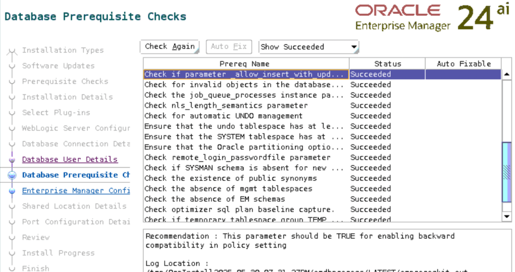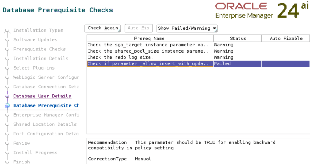 While installing Oracle Enterprise Manager 24ai, the check for the parameter value _allow_insert_with_update_check failed: