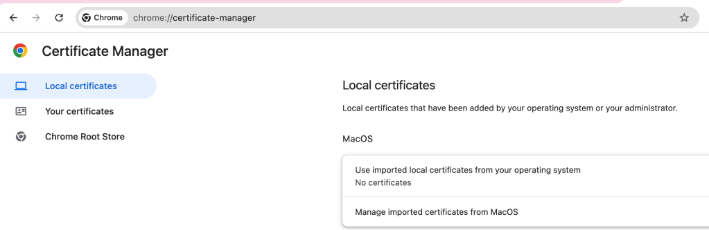 If you cannot find Keychain Access, then type chrome://certificate-manager/ in URL and click Manage imported certificates from MacOS